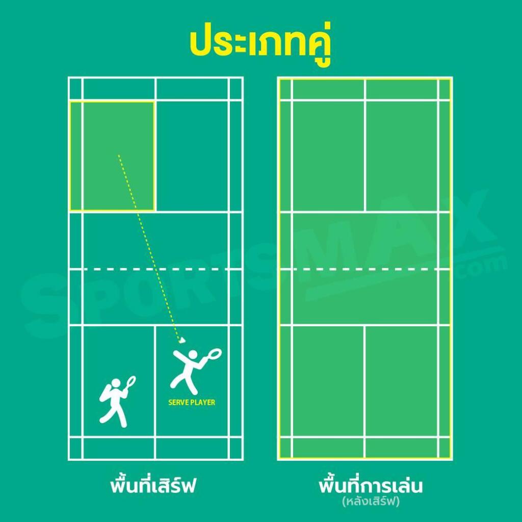 - ตำแหน่งยืนต้องอยู่ในช่องเสิร์ฟของตนเอง และตีเฉียงไปยังช่องเสิร์ฟฝั่งตรงข้าม